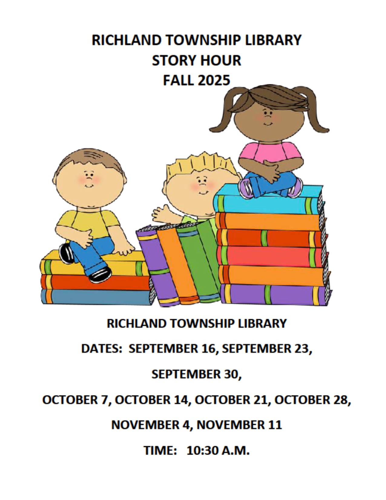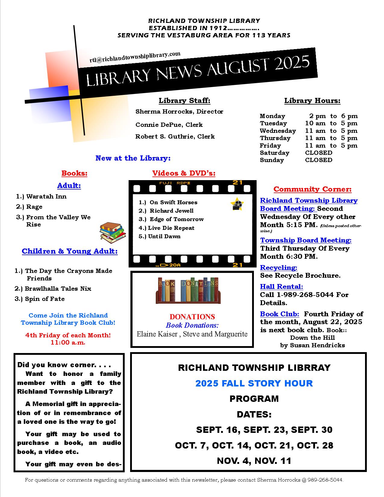 Richland Township Library - 8821 Third Street PO Box 220 - Vestaburg - 48891 Phone 989.268.5044 . . . . . . . . . . . . . . . . . . . . . . . . . . . . . . . . Fax 989.268.5629